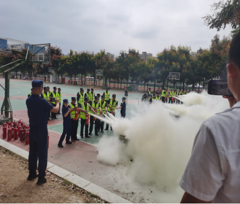随后,在教官的引导下,军训方队有序来到旁边的篮球场地进行了灭火实战培训,吴参谋现场讲解了灭火器使用要领及注意事项,前后共进行了十三轮次,500余名学生的实战培训。